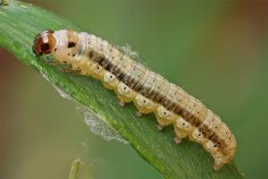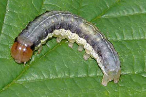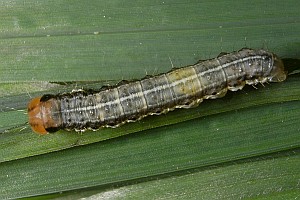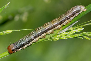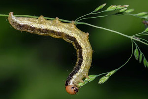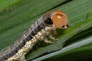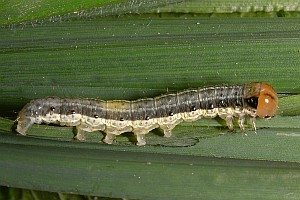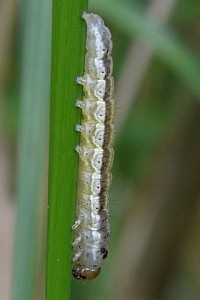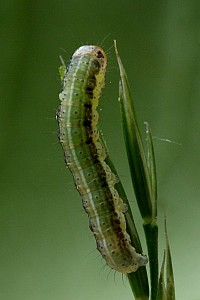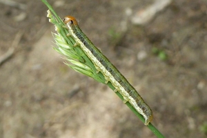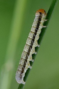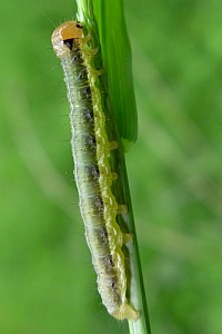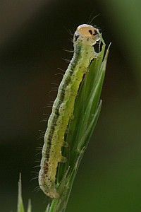 1-2: Jungraupe, Deutschland, Sachsen, Dresden-Blasewitz, Hausgarten, Raupe an der Spitze eines Rispengrases (Poaceae) sitzend, 17. Mai 2008 (Studiofotos: Franziska Bauer), det. Heidrun MelzerForum