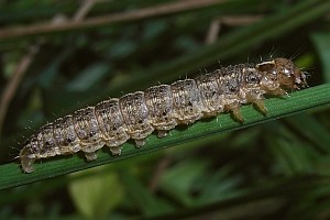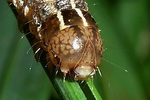 - Apamea crenata: Dorsale + Suborsalen auf Nackenschild gleichbreit (-> gutes Unterscheidungsmerkmal zu A. epomidion), Grundfarbe meistens Rosabraungrau, dann dunkelbraune Kopfkapsel mit schwarzer Netzmusterung (manche Tiere aber bleigrau, bei denen ist Kopfkapsel fast schwarz), Afterplatte variabel, keine Diapause im Winter, kurz vor Verpuppung wird sie auf einmal sehr blass