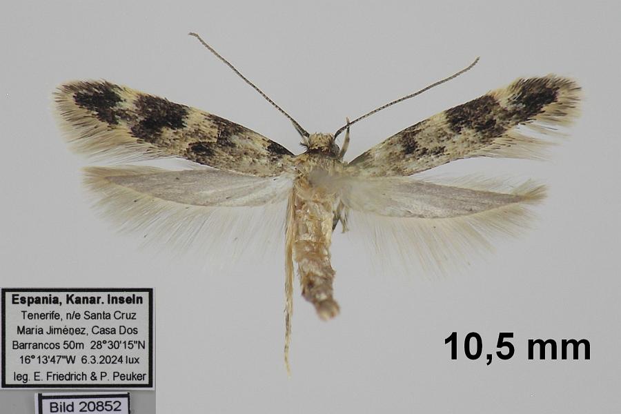 Falck & Karsholt (2021: 284) schreiben zum Holotypus: „Holotype ♂: SPAIN, TENERIFE, Arona, 500 m, 3-9-III-2013, leg. P. Falck, genitalia slide 2793PF (ZMUC).” Die immerhin 52 Paratypen stammen alle ebenfalls von Teneriffa und zwar von verschiedenen Stellen zwischen 10 und 1050 m.
