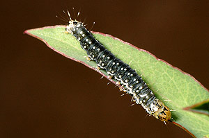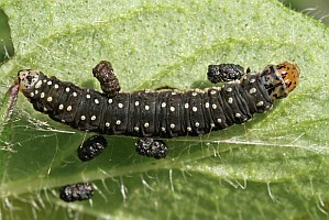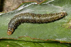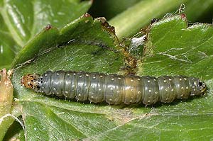 Schütze (1931: 174) stellt zur Raupe zusammen: "An Viburnum opulus und Viburnum lantana, Vaccinium uliginosum, Ledum, Salix repens, Alisma, Andromeda, Coronilla, Abies, Pinus silvestris, Juniperus, Comarum, Lysimachia, Scrophularia aquatica [gemeint ist wohl Scrophularia auriculata, evtl. auch Scrophularia umbrosa], Myrica, Lotus auf Mooren. Macht sich durch Zusammenballung der Blätter kenntlich (Sorhagen und andere).