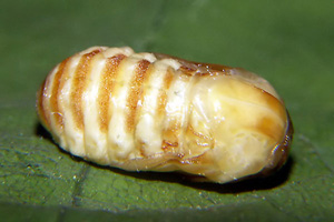 1-2: Deutschland, Nordrhein-Westfalen, Wassenberg-Myhl, Puppe aus oben bebilderter Raupe im geöffneten Kokon (Fotos: Claudia Mech)Forum
