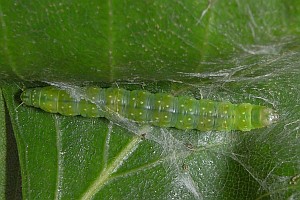 Die Raupe lebt zwischen zusammengesponnenen Blättern von Hänge-Birken und wahrscheinlich auch weiteren Birken-Arten, die aber so gut wie immer nicht konkret benannt werden. Ob die Moor-Birke eine so geringe Bedeutung hat, ist also noch zu klären. [tortricidae.com] listet Betula pendula ssp. mandshurica und Betula ermanii für Asien.