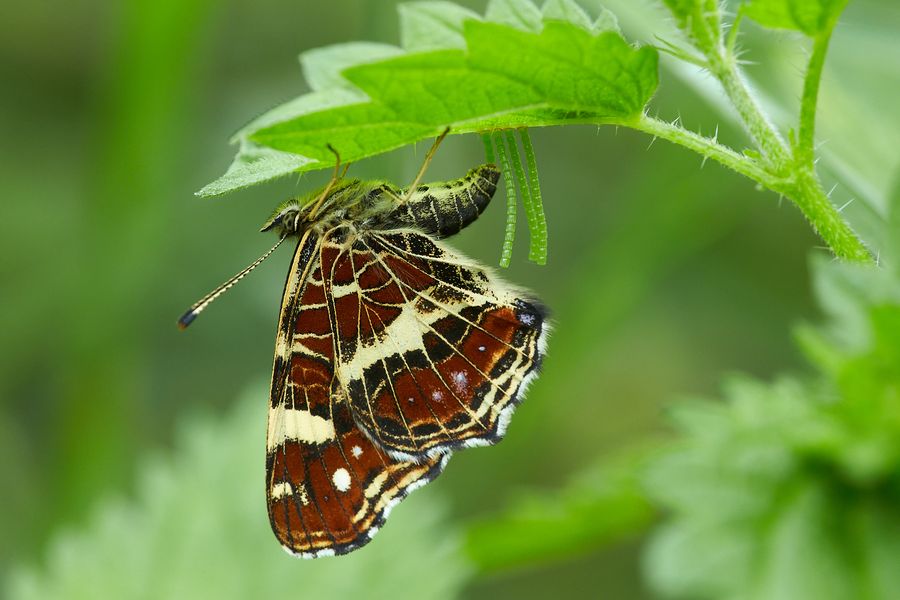 Und was ist mit dem Hopfen? Reinhardt (2007: 177) schreibt: "Fast ausschließlich wird die Große Brennnessel Urtica dioica als Raupennahrung angenommen, im Osten wohl auch Urtica kioviensis (?). Nach Fiedler & Ruf (2003) nehmen die Raupen keinen Hopfen als Nahrung an. Dagegen fand Stöckel (Reinhardt et al. 2007) 3 Raupen an wildem Hopfen (Humulus lupulus) und zog sie damit bis zur Verpuppung." Bei Reinhardt et al. (2007: 413) heißt es dazu konkret: "Die normale Raupennahrung ist die Große Brennnessel Urtica dioica. Stöckel (in litt. 20.12.1985) hat im August 1985 von Hopfen (Humulus lupulus 3 Raupen geklopft und damit weitergefüttert. Bei Fiedler et al. (2002) wurde Hopfen von den Raupen nicht angenommen." Die umfassenden Ausführungen von Fiedler & Ruf (2002: 265-266) verdienen es, detailliert zitiert zu werden: "In a Russian source (Korshunov & Gorbunov 1995) it is indicated that A. levana 'rarely' feeds on H. lupulus, although no details are recorded there. Despite the negative results obtained by Janz et al. (2001) this stimulated us to again test whether larvae of A. levana might accept that plant at least in captivity. In contrast to Janz et al. who tested each food plant in their study with only five first instar larvae, we at- tempted to obtain larger samples and confronted a wider range of larval stages in no-choice tests with cut young foliage of H. lupulus. The larvae used in the tests originated from the offspring of a number of field-collected mated females of the summer generation that had been sampled in the vicinity of Bayreuth (Northern Bavaria, Germany). Larvae were maintained in closed plastic containers (volume 1000cm3) lined with moist filter paper and kept at room temperature (22-25°C). In no case did we observe any signs of feeding on H. lupulus. This was true for first instars directly hatching from the egg with no prior feeding experience (N>100), as well as for first (N=30), second (N=15) and third instar larvae (N=15) that had been raised previously on U. dioica foliage. All larvae starved to death within 3-5 days. Frequently, the larvae were seen crawling around in the containers off the plant in search for suitable food. Our complete failure to induce feeding by A. levana larvae on H. lupulus indicates that in fact this plant species does not qualify as a food plant." Und was schließen die Autoren daraus? "It is at present impossible to decide where the discrepancy to Korshunov & Gorbunov's record (1995) comes from. It might still be possible that certain Siberian populations of A. levana do have the capacity to feed on H. lupulus. However, it seems remarkable in this respect that in his recent book Gorbunov (2001) no longer mentions any relationship between A. levana and H. lupulus. Hence, for the time being and until any conclusive data can be presented to show the contrary, we suggest to delete Humulus from the hostplant list of Araschnia butterflies, which appear in fact to be family-monophagous on Urticaceae." Und was sind jetzt für neue Schlüsse aus der Beobachtung Stöckels zu ziehen? Schwierig: Stöckel hat die Raupen "geklopft", also nicht nach Fraßspuren an der Pflanze gesucht. Es ist nicht zu erfahren, ob der Hopfen - wie oft - mit Brennnesseln verzahnt dort stand; es klingt sehr danach, dass die Raupen in der Zucht Hopfen als Futter akzeptierten - oder fraßen die Raupen gar nicht mehr und es kam zur Notverpuppung? Für mich klingt es so, als könnten die ausgewachsenen Raupen unter ganz besonderen Umständen doch einmal von Brennnesseln auf Hopfen wechseln - und über diese Umstände wissen wir nichts. Weitere Studien wären hier durchaus erwünscht.