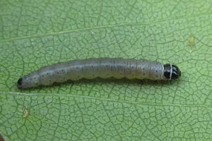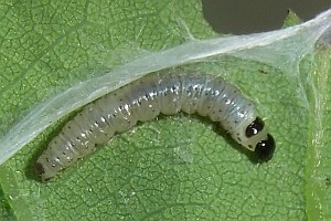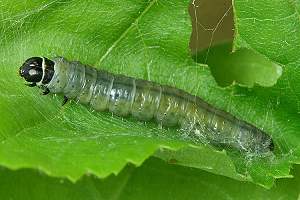 Kennel (1910: 130) stellte zusammen: "Die Raupe von Cac. xylosteana ist weißlichgrau, oder blaß grünlich oder dunkel grüngrau, Kopf, Nackenschild und Analklappe sind schwarz oder schwarzbraun. Sie lebt im Mai bis Anfang Juni polyphag, besonders an Quercus, auch Prunus cerasus, domestica, Pyrus, Sorbus aucuparia, Lonicera, Tilia, Rubus fruticosus, Salix caprea, Fraxinus, Myrica, selbst an Hypericum; sie verpuppt sich in ihrer Wohnung aus versponnenen Blättern."