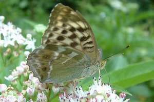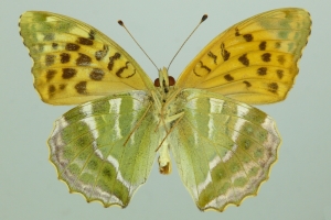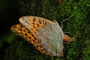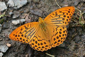 | A. paphia | ![]() | ![]() | ![]() | Oberseite 1 - bei ♂ 4 Duftschuppenstreifen auf M3, Cu1, Cu2 und A 2 - relativ große Postdiskalflecken 3 - bei ♀ Diskalflecken getrennt 4 - i.d.R. ohne Schimmer (außer bei f. valesina) Unterseite 5 - Vorderflügel bräunlich 6 - durchgehender, meist deutlicher Silberstreifen |