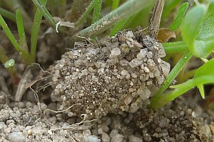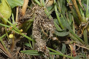 2: mit Sandkörnern belegter Verpuppungskokon im wurzelnahen Bereich von Kleinem Sauerampfer (Rumex acetosella): Deutschland, Sachsen, Noitzscher Heide bei Lindenhain, 2. Juni 2011 (det. & Freilandfoto: Heidrun Melzer)