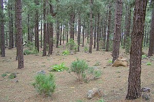 2: Lichtfangstelle, Ausschnitt aus der „Corona Forestal“ — ein Koniferenforst (Kanarenkiefer), welcher sich ringförmig um das Teíde-Massiv erstreckt und oft im Nebel der Passatwolke verschwindet, Spanien, Kanarische Inseln, Teneriffa, 4,5 km nördlich Arafo, 1350 m, 4. März 2010 (Foto: Egbert Friedrich)Forum