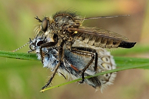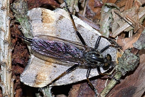 1: Raubfliege (Neoitamus socius oder Neoitamus cyanurus, det. Markus Gebel), vermutlich mit Hepialidae: Deutschland, Sachsen, Dresden-Bühlau, Dresdner Heide, 4. Juli 2021, Tagfund (Freilandfoto: Bernd Garbe)Forum