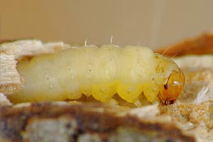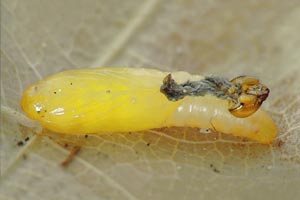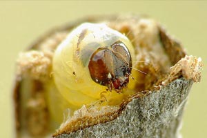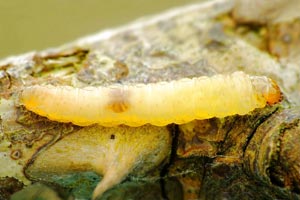 Schütze (1931) fasste zusammen: "Raupe August bis September [...] Die rote Raupe in den Hagebutten, welche durch Kotauswurf in der Krone und an den Raupengängen kenntlich sind, da die Raupe das Fleisch bis auf die Oberhaut verzehrt. Geht zur Verwandlung in dürres Holz, nicht in die Erde (Sorhagen). Zu gleicher Zeit und in ähnlicher Weise lebt in den Rosenfrüchten eine gelbliche fußlose Fliegenlarve; Spilographa alternata Fallén (Schütze)."
