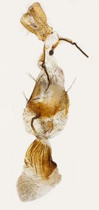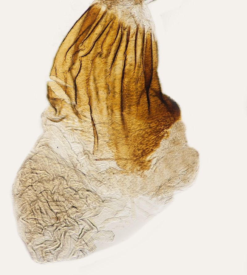 Ein Exemplar mit kammartigen Fühlern wie beim Männchen, aber mit unvollständigen weiblichen Geschlechtsorganen: die hinteren weiblichen Apophysen sind durch Teile der männlichen Valva ersetzt.