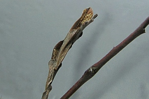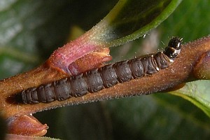 Die Raupen fertigen im Herbst an den Triebenden ihrer Nahrungspflanze ein festes Gespinst, worin sie den Winter überdauern. Man kann diese fest versponnen Gebilde im Winter gut finden. Sie sind die einzigen, welche noch an den ansonsten kahlen Zweigen zu sehen sind. (Friedmar Graf)