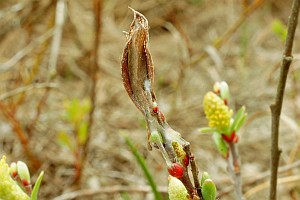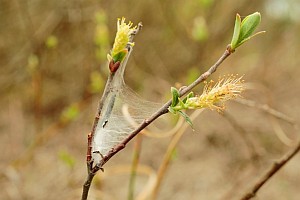4-6, dreieckige Raupengespinste in Zweiggabelungen von Kriechweide (Salix repens): Deutschland, Sachsen, Oberlausitz, Bärwalde, 127 m, 9. Mai 2012 (det. & Freilandfotos: Friedmar Graf) [Forum]
