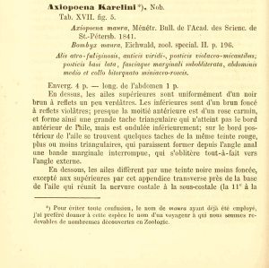 - Erstbeschreibung: Ménétriès, E. (1863): Descriptions de nouvelles espèces de lépidoptères de la collection de l'Académie Impériale des Sciences. III-ème et dernière partie. — In Ménétriès, E.: Enumeratio corporum animalium Musei Imperialis Acadediae Scientiarum Petropolitanae. Classis Insectorum. Ordo Lepidopterorum. Pars 3. 145-161, t. XV-XVIII. St.-Pétersbourg.