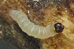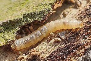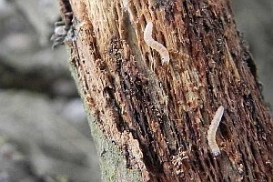 1-2: aufgerissene und zum Fotografieren abgelöste Rinde an Ginsterbusch, darunter Raupen, die hier die Schicht zwischen Kern und Rinde abnagen, Deutschland, Sachsen, Oberlausitz, Bernbruch, Steinbruch, 185 m, 9. Januar 2011 (det. & Fotos: Friedmar Graf)Forum