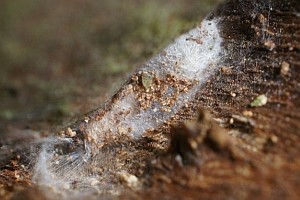 2: Verpuppungsgespinst, normalerweise unter Rinde, hier unter Zuchtbedingungen zwischen Rindenstückchen, Daten wie Bild 1 (Foto: Friedmar Graf)