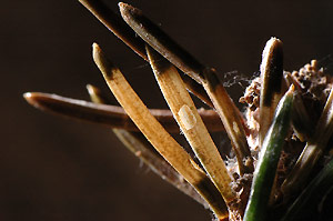 Frassspuren: Die befallenen Fichtennadeln zeigen eine runde Einstiegsöffnung in der unteren Nadelhälfte und sind säuberlich ausgehöhlt, nur die Spitze ist unversehrt, was im Gegenlicht gut erkennbar ist. [Rudolf Bryner]