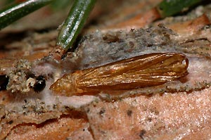 Nach Koster & Sinev (2003) miniert die Raupe jung (d.h. ab Spätsommer) in den Nadeln, später (Frühjahr) lebt sie in einer getarnten seidenen Röhre am Zweig und bohrt sich von dort aus bis zur Hälfte von der Basis her in die Nadeln ein.