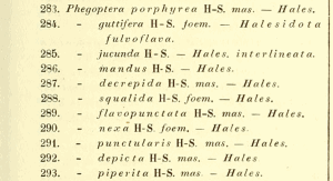 - Erstbeschreibung: Herrich-Schäffer (1850-1858): Sammlung neuer oder wenig bekannter aussereuropäischer Schmetterlinge: 1-84, pl. [1]-[120]. Regensburg (G. J. Manz).