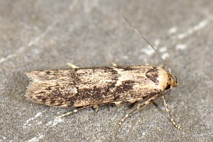 Auf UKmoths [Artseite auf UKmoths.uk] ist zu erfahren: "The larvae feed on a variety of foodstuffs, including decaying vegetable matter". Auf Großbriannien bezogen heißt es: ": In and on soft damp Dipsacus fullonum seedheads. January. (Emmet states 873 feeds on live and decaying conifer foliage, bird droppings and other dead or live organic matter, Sept.-June)."