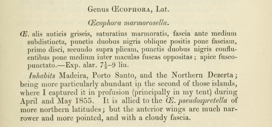 - Oecophora marmorosella Wollaston, 1858 [Originalkombination]