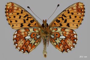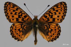 | Boloria euphrosyne |  |  | Oberseite 1 - dreieckige Randmonde (*) Unterseite 2 - gelbe Wurzelflecken schwach gezeichnet 3 - schwacher, manchmal fehlender schwarzer Punkt in ziegelroter Zelle 4 - ein Silberfleck 5 - restliche Mittelbinde gelb 6 - Kappen der silbernen Randflecken verschwommen braun-schwarz |