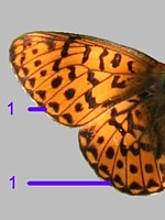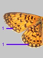 | Boloria selene | ![]() | ![]() | Oberseite 1 - pfeil- bzw. v-förmige Randmonde Unterseite 2 - alle Wurzelflecken kontrastreich gezeichnet 3 - stets kräftig ausgeprägter schwarzer Punkt in bräunlicher Zelle 4-5 - drei Silberflecken in Mittelbinde 6 - Kappen der silbernen Randflecken schwarz und scharf gezeichnet |