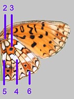 | Boloria euphrosyne | ![]() | ![]() | Oberseite 1 - dreieckige Randmonde Unterseite 2 - gelbe Wurzelflecken schwach gezeichnet 3 - schwacher, manchmal fehlender schwarzer Punkt in ziegelroter Zelle 4 - ein Silberfleck 5 - restliche Mittelbinde gelb 6 - Kappen der silbernen Randflecken verschwommen braun-schwarz |