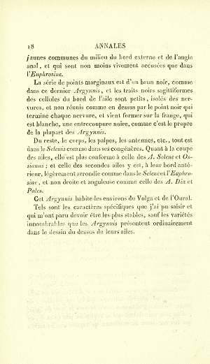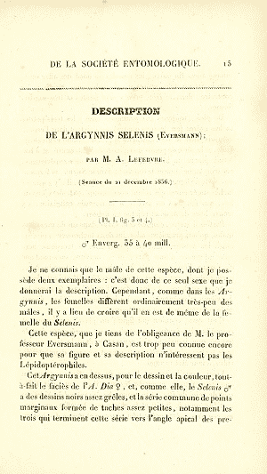 - Lefebvre, A. (1837): Description de l'Argynnis selenis (Eversmann). — Annales de la Société Entomologique de France 6: 15-18 + pl. 1. Paris (F. G. Levrault).