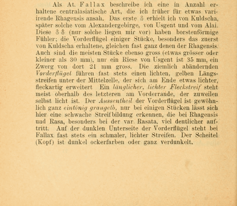 Kallies (1998) legt einen Lectotypus und einen Paralectotypus fest: "Lectotypus ♂ (hier designiert), Fallax Stgr. / Origin. / Kuldja [18]79 Alph[eraky], /20.V. /ex coll. Staudinger (ZMHU), Paralectotypus ♂, Origin. / Alai [18]85 Hbh. [Haberhauer] / ex coll. Staudinger (ZMHU)."