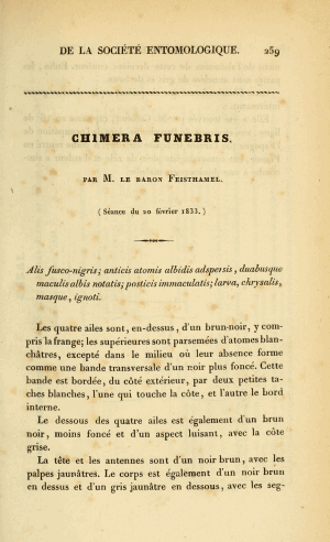 - Erstbeschreibung: Feisthamel (1833): Chimera funebris. — Annales de la Société entomologique de France 2: 259-260. Paris (Méquignon-Marvis).