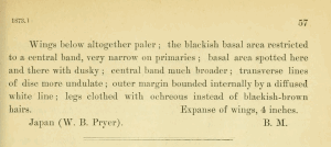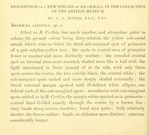 • Erstbeschreibung: Butler, A. G. (1873): Description of a New Species of Brahmaea, in the Collection of the British Museum. — The Entomologist's Monthly Magazine 10: 56-57. London (John van Voorst).