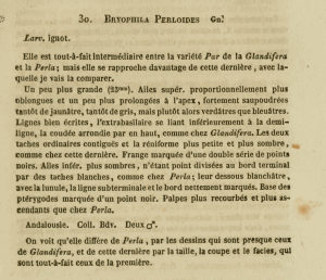 Guenée (1852: 29) bemerkte in seiner Erstbeschreibung, die auf der Basis von zwei ♂♂ aus Andalusien erfolgte: « On voit qu’elle diffère de Perla [Bryophila domestica], par les dessins qui sont presque ceux de Glandifera [Bryopsis muralis], et de cette dernière pa la taille, la coupe et le facies, qui sont tout-à-fait ceux de la première. » Er sah ein Taxon irgendwo zwischen diesen beiden Arten, legte sich aber fest, dass er mehr den Vergleich mit Bryophila domestica sah: " « Elle est tout-à-fait intermédiaire entre la variété Par de la Glandifera et la Perla; mais elle se rapproche davantage de cette dernière, avec laquelle je vais la comparer. »