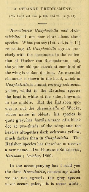 - Erstbeschreibung: Stainton, H. T. (1861): A strange predicament. — The Entomologist's Weekly Intelligencer 9 (228): 156-157. London [Digitalisat von Google Books im Viewer der Hathi Trust Digital Library].