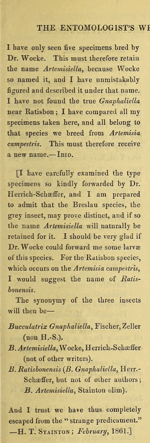 - Stainton, H. T. (1862): The natural history of the Tineina 7: I-IX, 1-251, Bucculatrix pl. I-IV, Nepticula pl. VIII-XI. London (John van Voorst) – Paris (Deyrolle) – Berlin (E. S. Mittler und Sohn). — Digitalisat auf archive.org: [106-113], [Bucculatrix pl. III fig. 3].