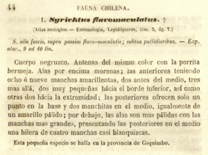 - Erstbeschreibung: Blanchard, E. (1852): Fauna Chilena - Insectos - Orden VI Lepidopteros. — In: Gay, C. (1852): Historia fisica y politica de Chile. Zoología 7: 1-112. — Digitalisat auf biodiversitylibrary.org: [44]
