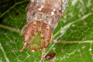2: Raupe kurz vor dem Schlupf schon zu erkennen, Deutschland, Bayern, Jachenau 700 m, 30. Juli 2019 auf Erle, Tagfund, Falterschlupf 13. Juni 2020 (Zuchtfoto: Christine Neumann)Forum