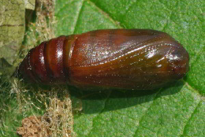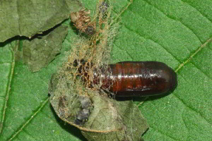 2-3: Deutschland, Sachsen, Chemnitz, ca. 350 m, Puppengespinst mit Puppe an Erlenblatt leg. 2. August 2014 (Studiofoto: Marion Friedrich), cult. zum Falter und det. Marion Friedrich, conf. Werner ReitmeierForum