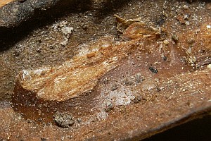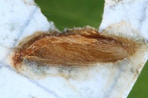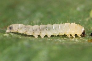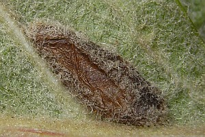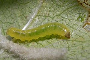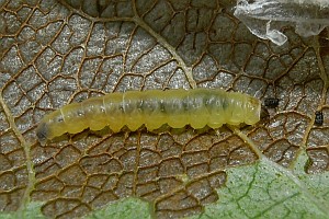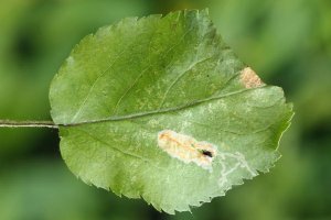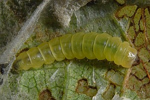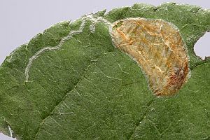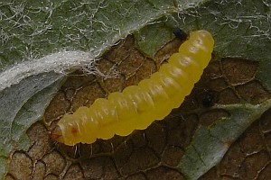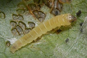 - Larve verlässt die Mine bald durch ein Loch und frisst unter einem nach unten(!) gerichteten Blattumschlag weiter. Dieser kann am selben oder an einem benachbarten Blatt sein.