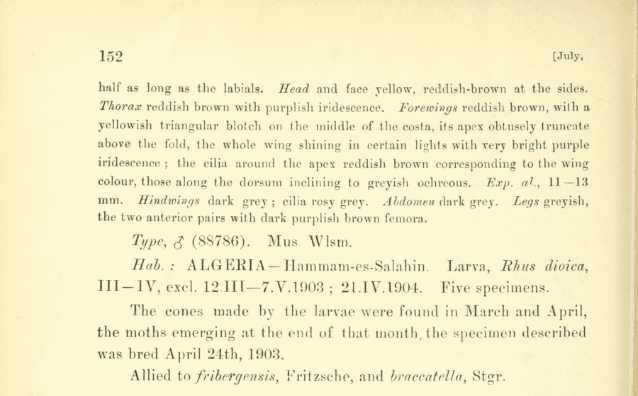- Erstbeschreibung: Walsingham (1907): Algerian Microlepidoptera. — The Entomologist's Monthly Magazine 43 (= second series 18): 6-10, 55-58, 125-129, 147-154, 187-195. London (Gurney & Jackson).