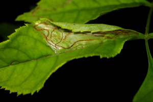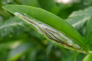 4: noch mit Raupe besetzte Jugendmine an Liguster (Ligustrum spec.): Deutschland, Niedersachsen, Bad Nenndorf, 60 m, Bahnhof, 23. Mai 2017 (det. & Freilandfoto: Tina Schulz)