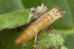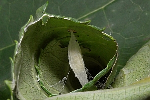 2: Blatttüte mit Puppe, Deutschland, Nordrhein-Westfalen, Kreis Lippe, Lage, an Ligusterhecke (Ligustrum sp.) von Garteneinfriedungen kurz unterhalb der Triebenden, 18. August 2008 (Foto: Dieter Robrecht), leg. & det. Dieter Robrecht & Hans Retzlaff, cult. Dieter Robrecht