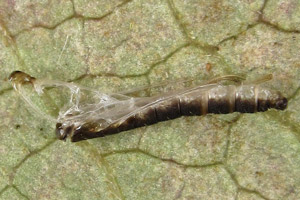 3: Verpuppungsgespinst, Deutschland, Sachsen, Dübener Heide, Umgebung von Doberschütz, Raupe leg. 15. Juli 2008, 20. Juli 2008 (Studiofoto: Heidrun Melzer)Forum