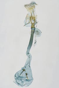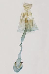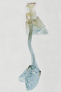 1-2: ♀, [1] herkömmliche Einbettung, ventral, [2] nicht eingebettet, lateral: Österreich, Wien, Lobau, leg. Raupe an Schwarzerle (Alnus glutinosa) 23. Juli 2011, e.p. 3. August 2011, leg., cult. & det. Oliver Rist, conf. durch GU Peter Buchner (Präparation & Mikro-Foto: Peter Buchner)