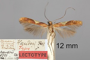 Rebel (1906) begründet die Wahl des Artnamens: Ein Pärchen [...] von Herrn Hauder erbeutet [...], bilden die im Hofmuseum befindlichen Typen. Nach ihrem um die Erforschung der Lepidopterenfauna Oberösterreichs bereits sehr verdienten Entdecker benannt." Mit "Herrn Hauder" war hier der weit über Oberösterreich hinein bekannte und an sehr vielen Entdeckungen zu Kleinschmetterlingen beteiligte, fachlich hoch versierte Hobby-Entomologe und "Bürgerschullehrer" Franz Hauder (* 12.9.1860 Aschach/D. † 6.10.1923) gemeint [Zugang zu Nachrufen und zur Literaturliste auf der Seite von zobodat.at]