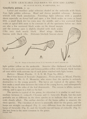 - Erstbeschreibung: Busck, A. (1920): A new Gracilaria injurious to Avocado (Lepid.). — The Canadian Entomologist 52 (8): 239.