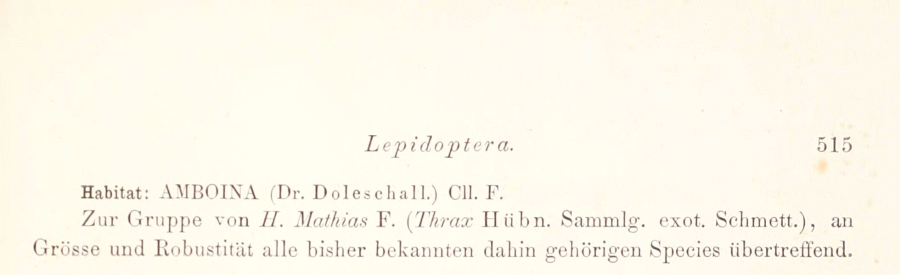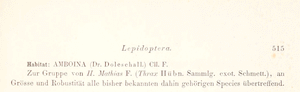 - Erstbeschreibung: Felder & Felder (1864-1867): Reise der österreichischen Fregatte Novara um die Erde in den Jahren 1857, 1858, 1859 unter den Befehlen des Commodore B. von Wüllerstorf-Urbair. Zoologischer Theil. Zweiter Band. Zweite Abtheilung: Lepidoptera. I-VI, 1-549. Wien (Kaiserlich-königliche Hof- und Staatsdruckerei). — Digitalisat auf biodiversitylibrary.org: [514]