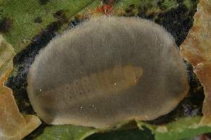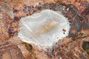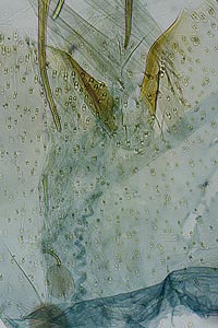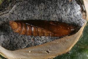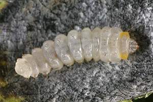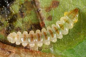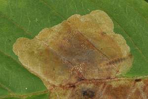 Eier: Die Eier sind mit bloßem Auge gerade noch als weißliche Punkte auf der Oberseite der Kastanienblätter erkennbar. Ein Dutzend bei der Eiablage beobachtete Weibchen zeigten alle das gleiche Verhalten: Zunächst dreht sich der Falter, während er beide Fühler lebhaft gegenläufig vor und zurück bewegt, mehrmals auf der Stelle im Kreis. Dann hält er für einige Sekunden inne, krümmt den Hinterleib gegen die Blattfläche und vibriert im Augenblick der Eiablage mit dem ganzen Körper. Fast alle Eier werden in Blattadern abgelegt (vgl. Bild 2; Bild 1 zeigt eine seltene Ausnahme; Beobachtung von Jürgen Rodeland am 22. Juni 2007).