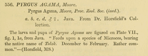 - Erstbeschreibung: Horsfield, T. & F. Moore (“1857”) [1858]: A Catalogue of the Lepidopterous Insects in The Museum of The Hon. East-India Company 1: I-V, 1-14, Systematic List (unpaginated, 11 pp.), 17-278, appendix I-IV, index 1-11, content of plates (unpaginated, 7 pp.), pl. I-XII, pl. Ia-VIa. London (W M. H. Allen and Co.). — Digitalisat auf biodiversitylibrary.org: [249], [pl. VII, figs. 1 und 1a]