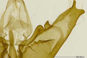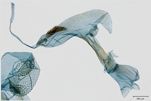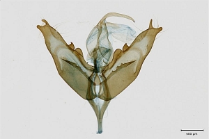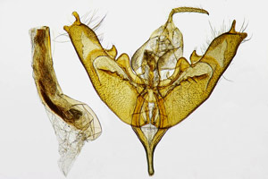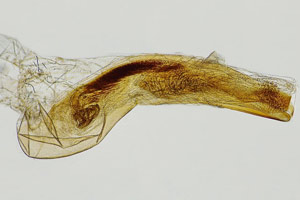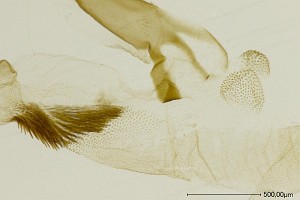 1-5: (2: = Detail rechte Valve), (3: = Aedoeagus mit evertierter Vesica), (4: = Detail Vesica), (5: = Detail Vesica im Durchlicht)), ♂, 1 = Valvenkomplex: Portugal, Algarve, Caldas de Monchique, 37.285° N 8.564° W, aufgelichteter Eichenbuschwald im hügeligen Gelände, ca. 300 m, 13. April 2010, am Licht (leg., präp., det. & fot.: Hartmuth Strutzberg)Forum