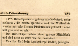 - Erstbeschreibung: Bremer, O. (1861): Neue Lepidopteren aus Ost-Sibirien und dem Amur-Lande, gesammelt von Radde und Maack. — Bulletin de l'Académie impériale des sciences de St.-Pétersbourg 3: 461-495.
